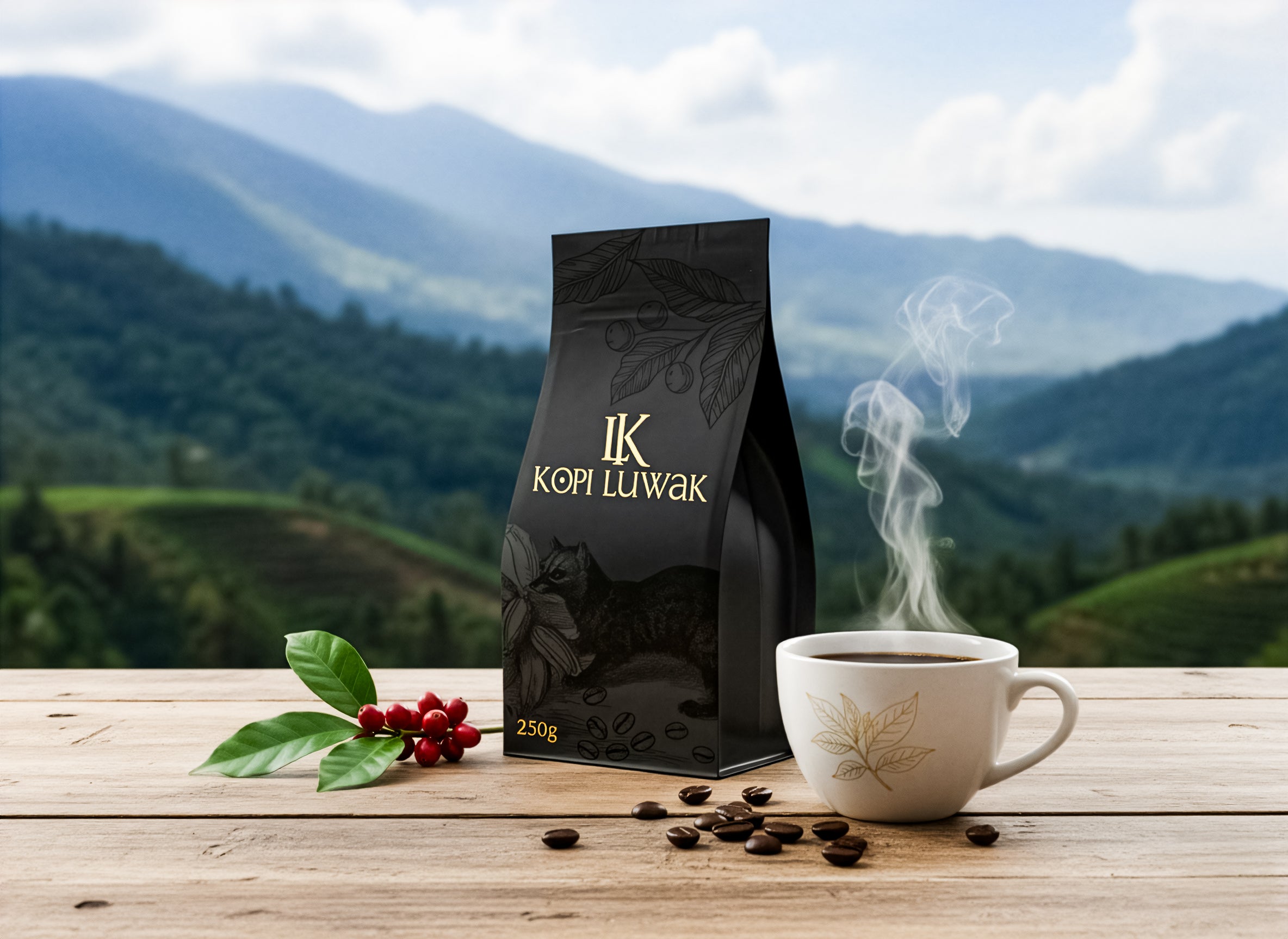 A premium brand identity for Kopi Luwak. The packaging evokes richness, authenticity, and tradition, helping the product stand out on shelves and online marketplaces.