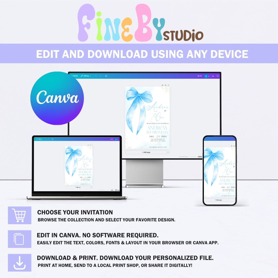 Editable Blue Bow Invitation | Canva Template | Baby Shower & Birthday Invite