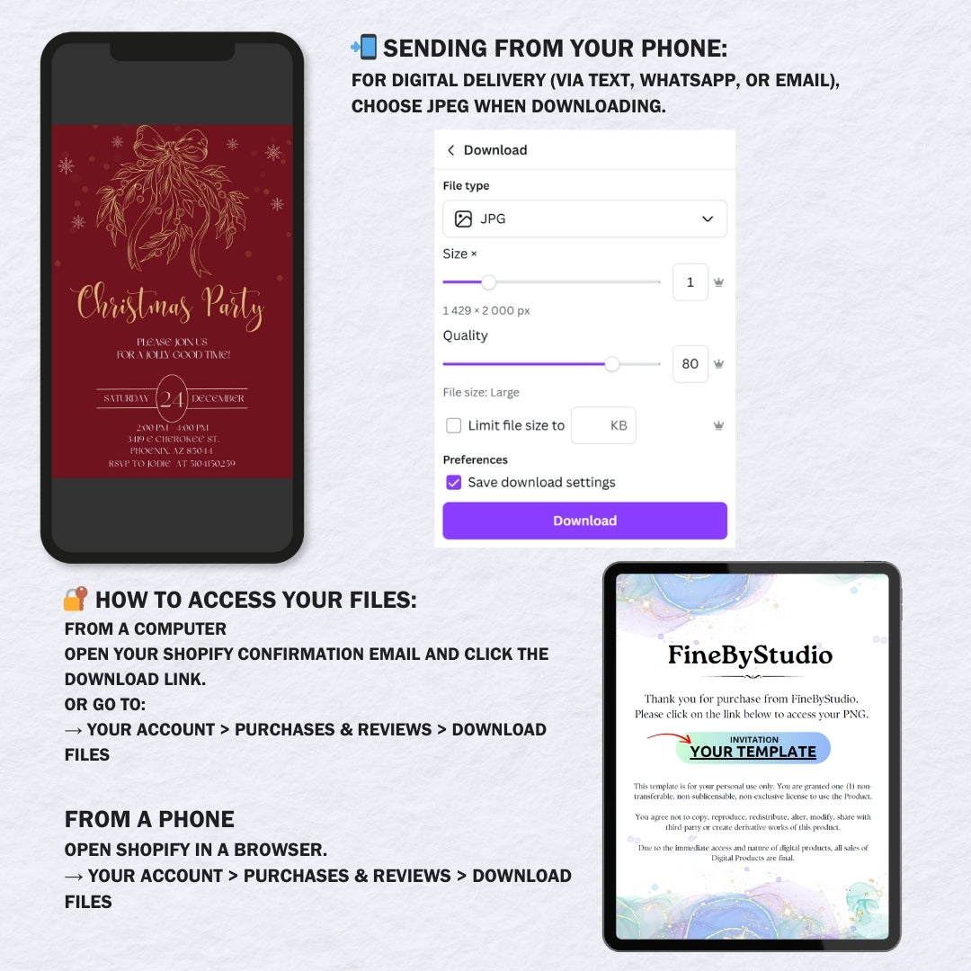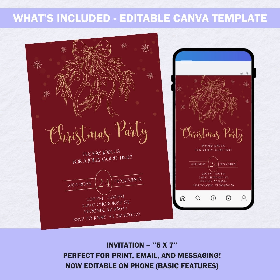 Elegant Burgundy & Gold Christmas Party Invitation Template | Editable Holiday Dinner Invite