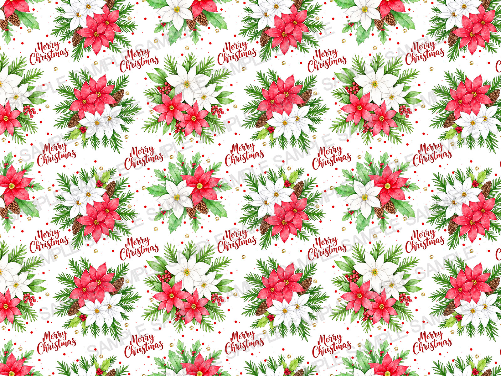 Celebrate the season with this elegant watercolor pattern featuring red and white poinsettias, pine sprigs, and festive “Merry Christmas” text. Perfect for Christmas wrapping paper, packaging, fabrics, and seasonal crafts.