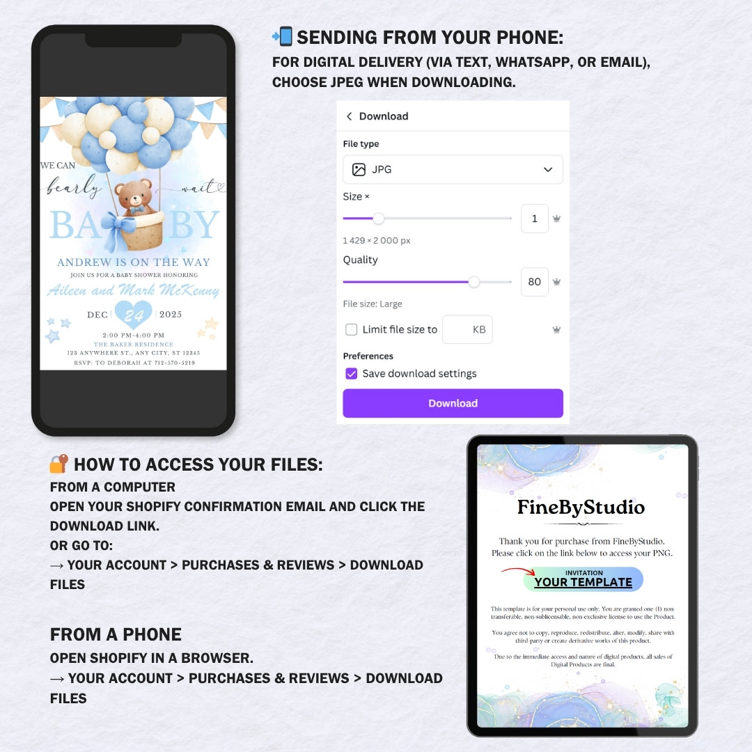 This is an editable Canva template that you personalize yourself on the Canva website. Phone and tablet editing is available, but desktop use is strongly recommended for best results. Edit your design, download, and either print it or send it digitally to your guests.